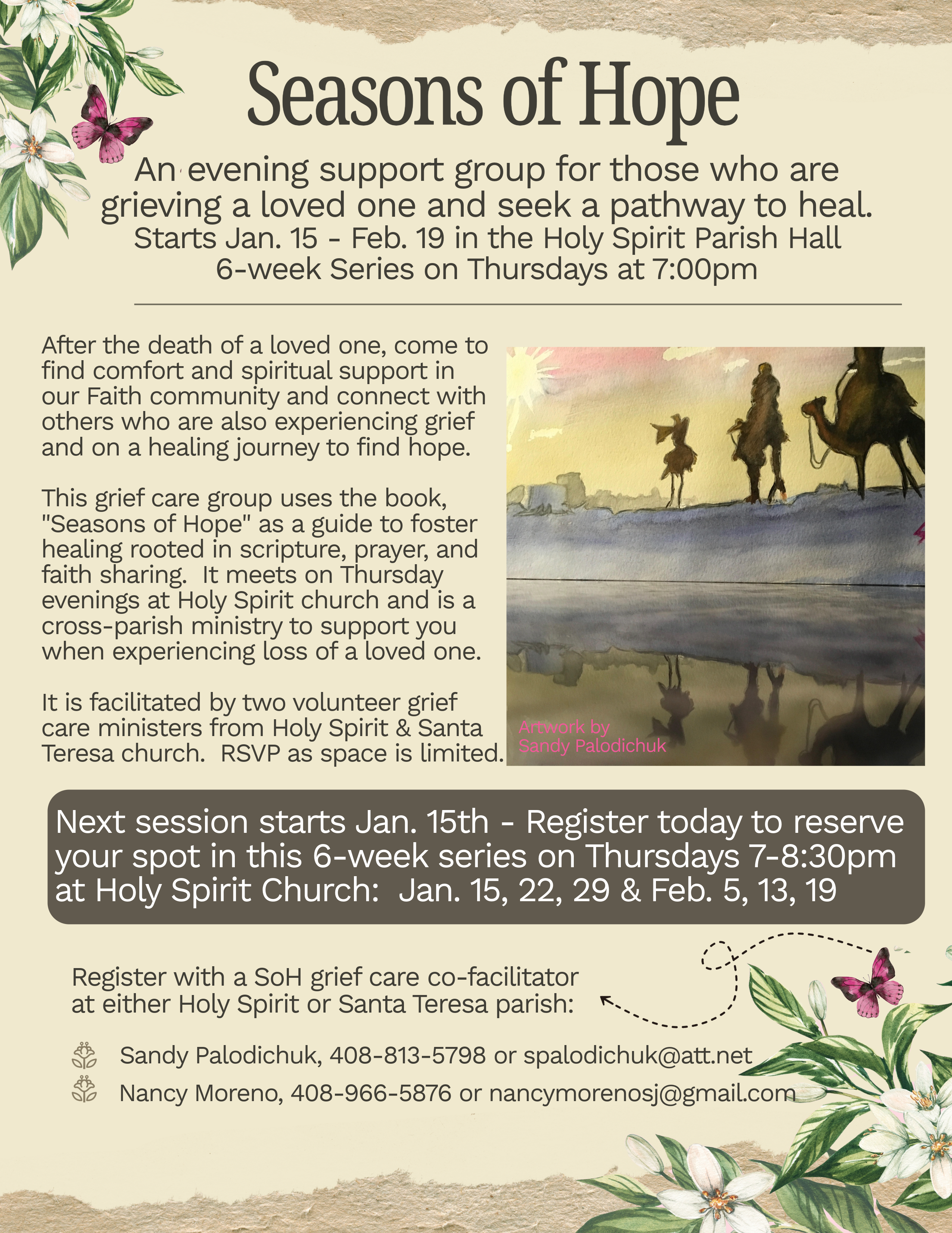The next Seasons of Hope, a 6-week series on Thursday evenings, starts Jan. 15th. It is held at Holy Spirit Church. Registration required as space is limited. Please contact one of the co-facilitators listed on the flyer